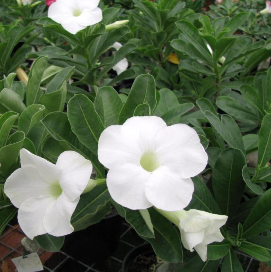 Adenium Lucky Lucky отличается своими снежно-белыми небольшими немахровыми цветками с округлыми тонкими лепестками. Горло цветков белое с желто-зеленым оттенком. Цветет сорт в течение теплых месяцев года. Листья длинные, закругленные, темно-зеленые со светло-зелеными краями.