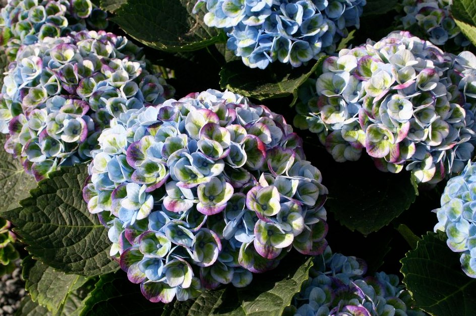 Гортензия крупнолистная Magical Revolution обильно и продолжительноцветущая огромными, крепкими, яркими, розово-зелено-голубыми, с малиновыми краями лепестков, шаровидными соцветиями, диаметром 20 см. Высота куста около 1,5 м. Побеги толстые, крепкие. Листья тёмно-зелёные.