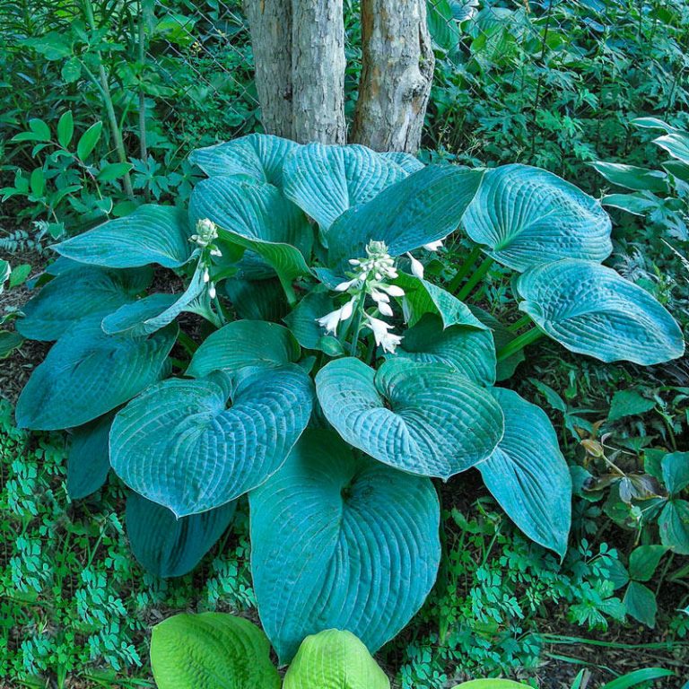Хоста Bluе Umbrеllаs – гигантское гибридное растение, овальные сине-зеленые листья которого по форме напоминают зонтики. В молодом возрасте они бледно-голубое, но к осени меняют свой цвет на ярко-зеленый. Огромные листовые пластины, в длину достигающие до 40 см, имеют превосходную структуру, они плотные, округлые, с ярко выраженной текстурой. Кожистые, шелковистые, листья образуют огромный куст вазообразной формы, на котором в июле распускаются светло-лавандовые цветы. На ярком свету они приобретают белую окраску. Сорт в основном предпочитает влажные почвы, прекрасно растет в тени, но может легко выдерживать утреннее или вечернее солнце.