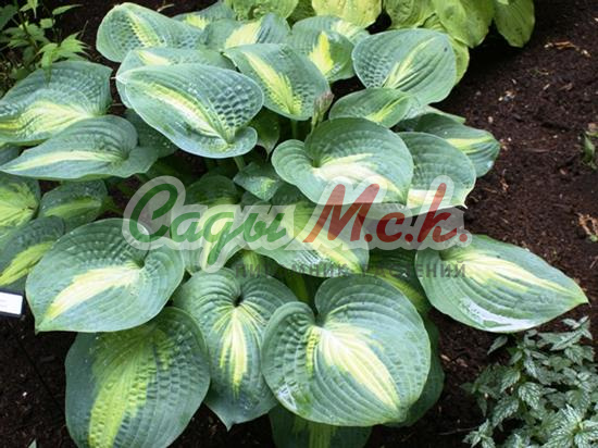 Хоста Love Pat. Листья у этого сорта очень крупные, широкие, практически круглые, ребристые, насыщенного сине-голубого цвета, сильно жатые, текстурированные, чашевидной формы. Куст растёт в виде большой эффектной куртины, густой, мощный, высотой до 50-70см. Цветет в июле обильно и продолжительно, крупными, почти белыми цветами без аромата.