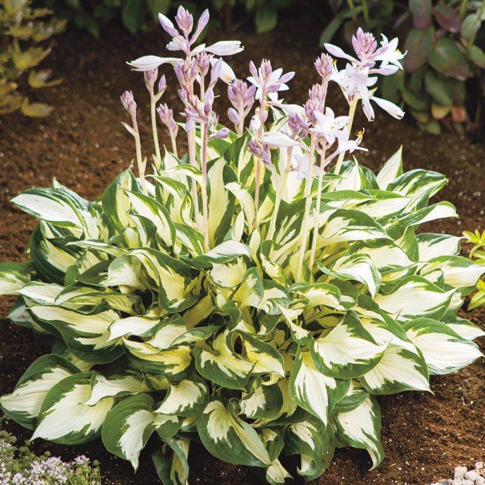 Хоста гибридная Пол Ревир – дивный сорт с волнистыми листьями, извивающимися, словно морские волны! Очень необычный облик, способный зажечь даже самую скромную садовую композицию! Озорные и закрученные в разные стороны листья, выбеленные в центральной части пластины, добавят стиля и свободы композициям даже начинающего ландшафтного дизайнера. Крупный зелёный кант ярко контрастирует с белой окраской. И так весь сезон! В середине лета над пышным кустом появляются высокие цветоносы с нежно-фиолетовыми цветами. Контраст усилится, создав необычайно интересный вид.