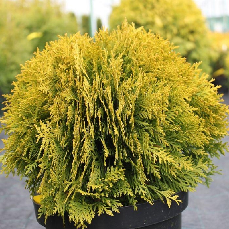 Туя западная Мириам - вечнозеленый хвойный кустарник. Форма кроны плотная, шаровидная. Медленнорастущая форма, высота и ширина до 80 см. Хвоя чешуйчатая, золотисто-желтая, густая, зимой приобретает оранжевый оттенок. Корневая система поверхностная, чувствительна к уплотнению почвы.